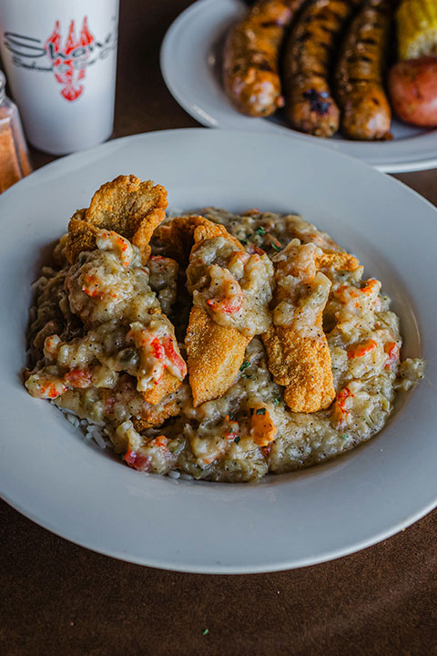 3 pieces of fried catfish over a bed of rice, topped with Étouffée.
