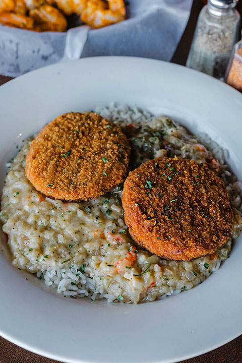 2 crab cakes served over rice and smothered in Crawfish Étouffée.