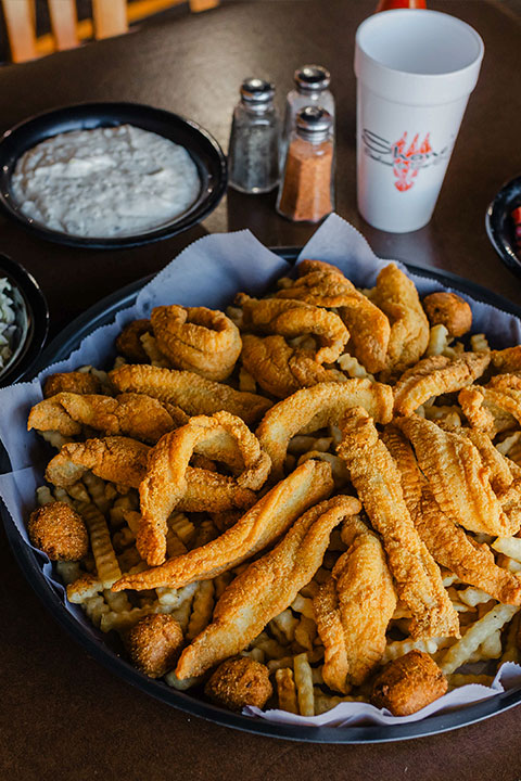 20 pieces served with fries, hushpuppies, and beans. Serves 4-7.  Served with tartar sauce.